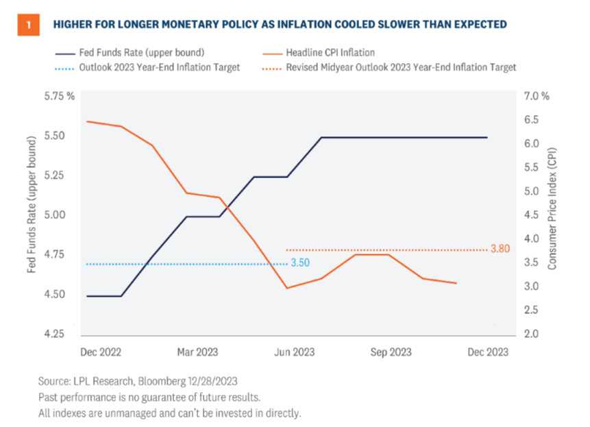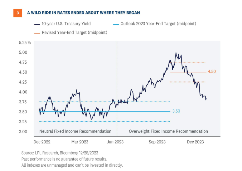And while we underestimated the resiliency of the U.S. economy, we did outline in our 2023 Outlook that “the path of interest rates will certainly be largely influenced by the Fed’s behavior, which will be guided by economic growth and inflation data.” So, as the economy continued to exceed expectations, interest rates went up by more than anticipated, and the chances for a recession went down, which in turn led the Fed to stick to its “higher for longer” approach—rather than lowering rates to stave off a looming recession.