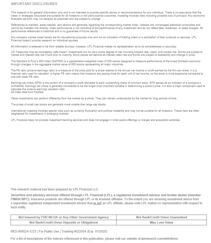 As we look ahead to 2024, our year-end fair value target range for the S&P 500 is 4,850 –4,950. That range is based on 1) a price-to-earnings ratio (P/E) of 19.5, in line with the five-year average, and 2) our projected 2025 S&P 500 earnings per share (EPS) of $250, just 6% above our 2024 earnings estimate.