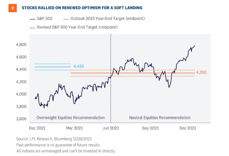 Stocks recovered quickly as investors became more comfortable with the banking sector risk being more idiosyncratic than systemic. The soft-landing narrative also gained traction, and the S&P 500 promptly climbed to key resistance at 4,200 by June. At this time, technology was overbought, market leadership was particularly narrow, and valuations appeared full, given the economic backdrop. As a result, we lowered our outlook on equities to neutral from overweight and simultaneously upgraded our view on fixed income to positive from neutral, recommending investors take advantage of increasingly attractive yields via high-quality fixed income. While neutral on equities is not negative, and the rating changes allowed us to move fixed income to positive, we nonetheless learned our lesson to channel our inner Journey and “hold onto that feeling” to keep believing in this bull market. We also had some other notable wins with our upgrade of large caps to positive from neutral in May and our consistent underweight recommendation to emerging markets.